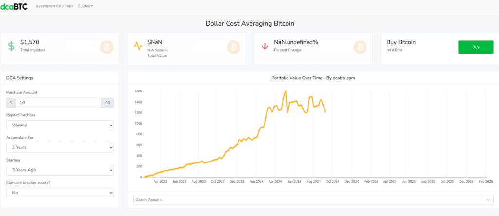Tool to calculate historical Bitcoin returns using Dollar-Cost Averaging (DCA) strategy.