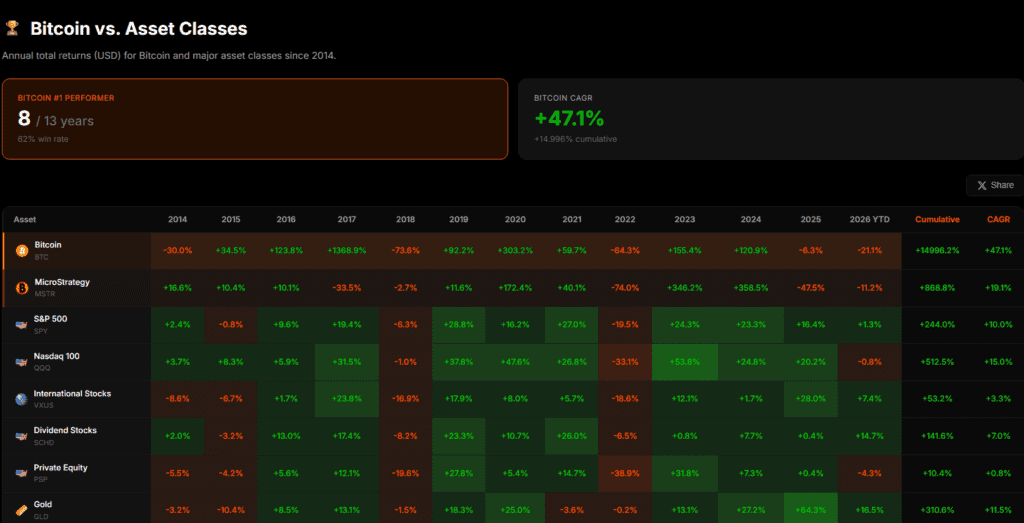 Shows annual total returns of Bitcoin versus other major asset classes.