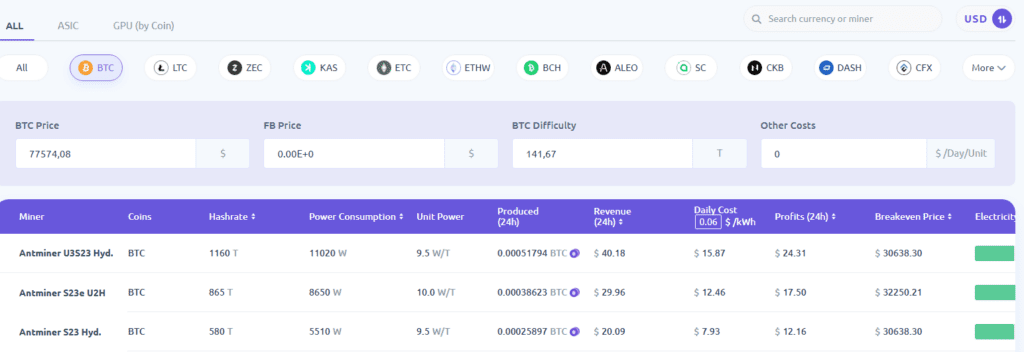 Lists miner models with hashrate, power consumption, 24-hour revenue, and profit metrics in BTC or USD (depending on settings).